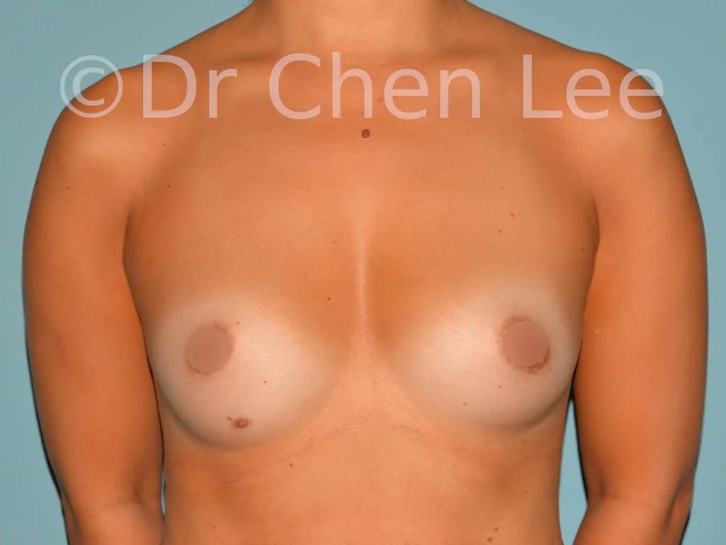This 43-year-old Asian woman desired larger breasts. Her breast augmentation was performed by placing the breast implants in a submuscular position. The breast implants used were Natrelle Inspira N-SSM405, with the following characteristics: