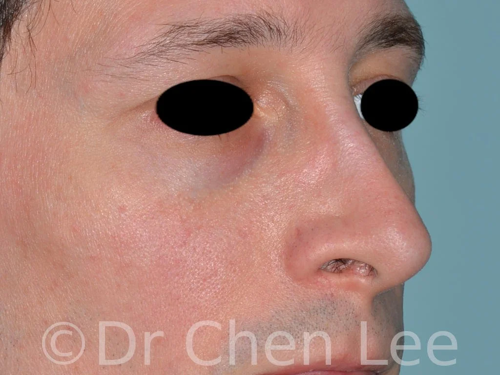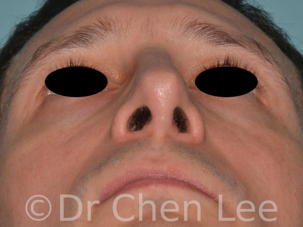 This 37-year-old man had residual nasal deformities following a closed rhinoplasty performed 7 years ago by another surgeon. A secondary nose job was performed to address the deformities. Photos were taken before and after Dr. Chen Lee performed a secondary rhinoplasty. These photos show persisting nasal asymmetry from a large septal deviation and collapse of the middle nasal vault. Dr. Chen Lee performed an open rhinoplasty with extensive cartilage grafts harvested from the patient’s nasal septum. The cartilage grafts were placed as spreader grafts to straighten the septum and correct the collapse of the internal nasal valve. After photos were taken 7 months following Dr. Chen Lee’s secondary open rhinoplasty using cartilage grafts harvested from the nasal septum.